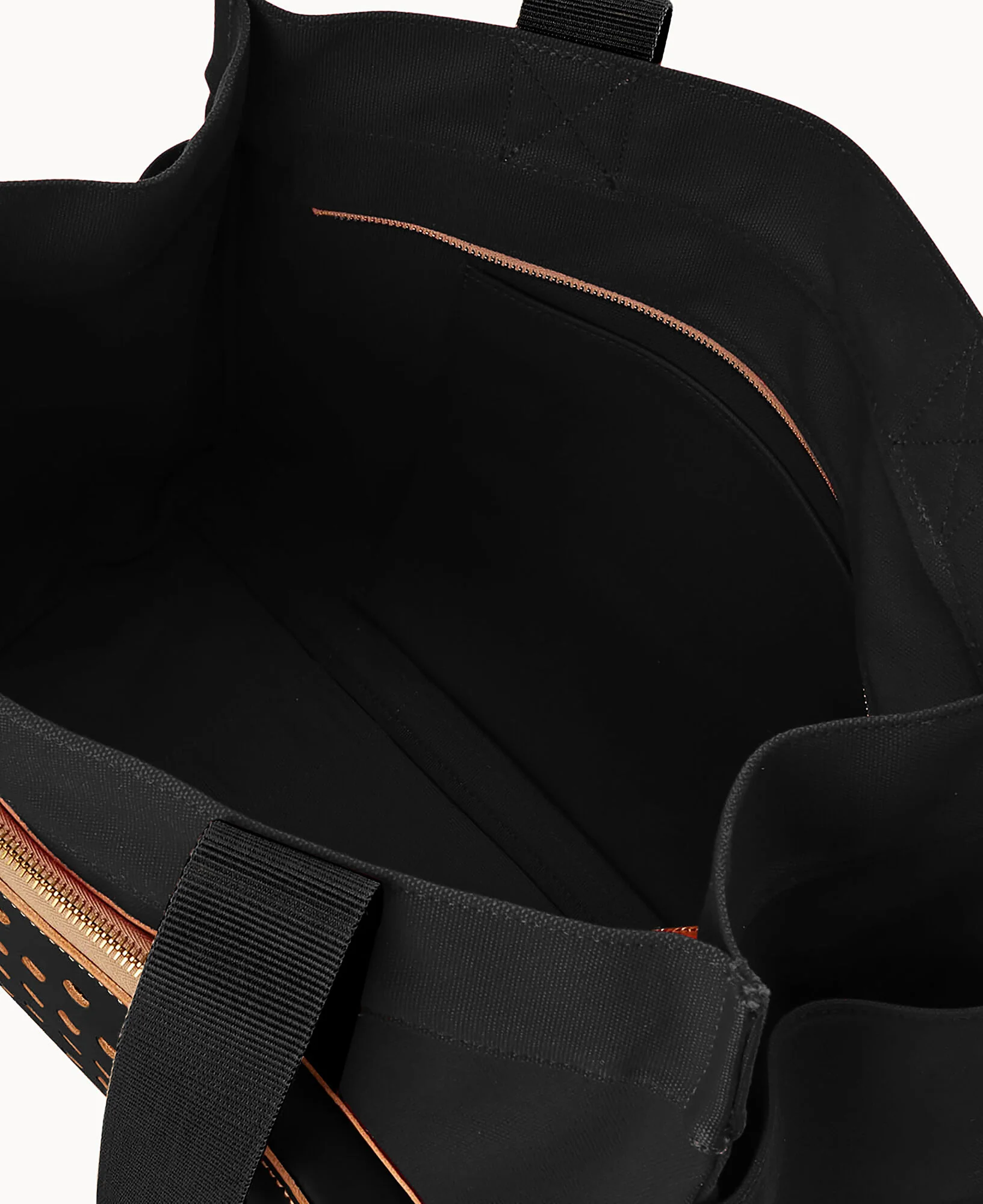 Five outside slip pockets. Two inside slip pockets. Zipper closure.