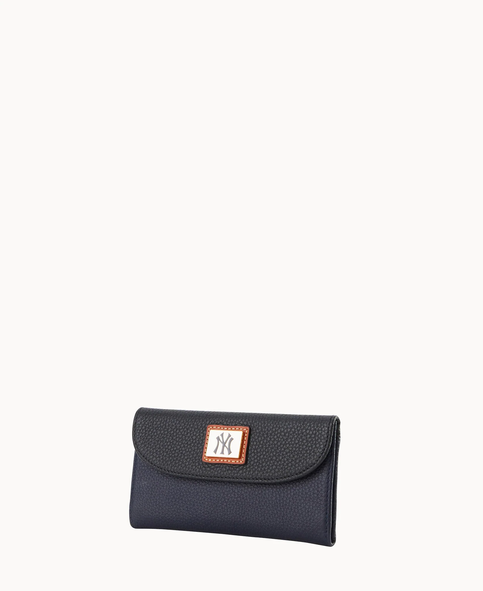 One outside zip pocket. One inside pocket. License pocket with window. Two bill compartments. Seven credit card slots. Lined. Feet. Snap closure.