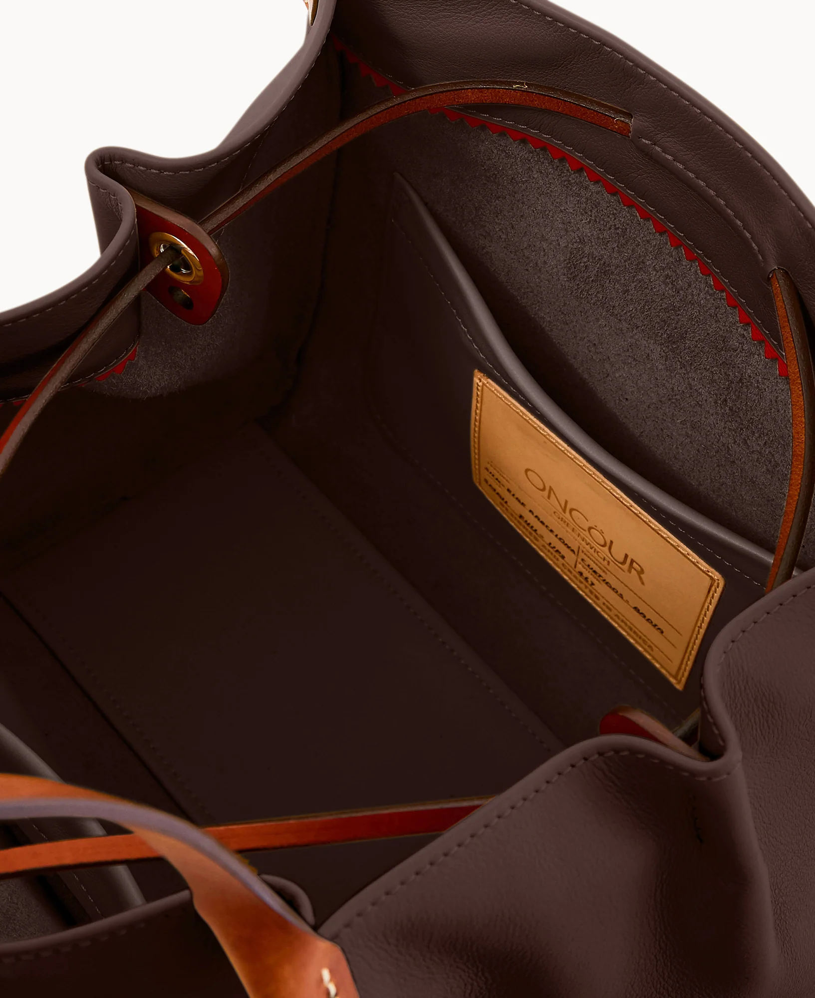 Two inside pockets. Inside key hook. Strap drop length 5". Drawstring closure.
