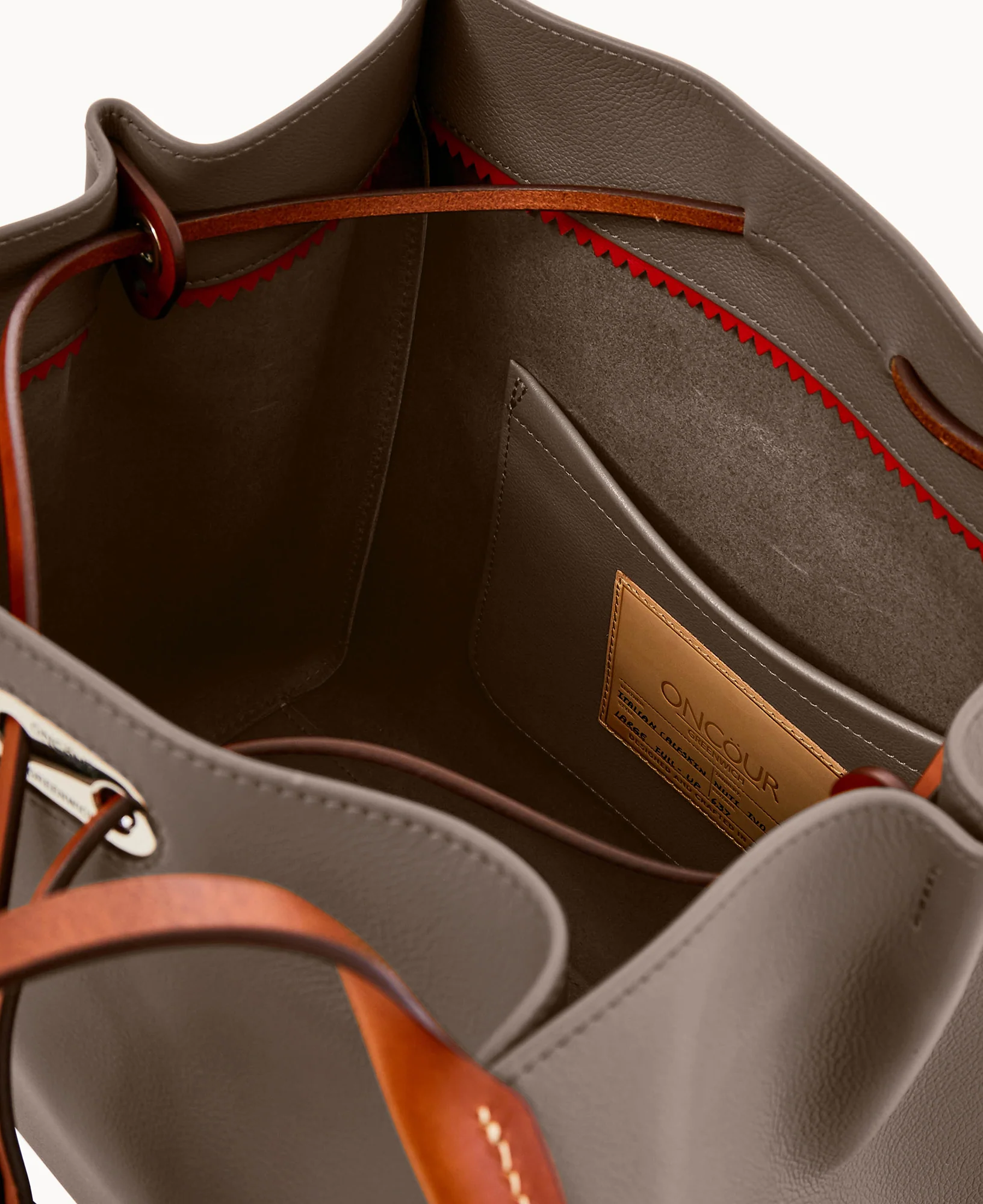 Two inside pockets. Inside key hook. Strap drop length 11". Drawstring closure.